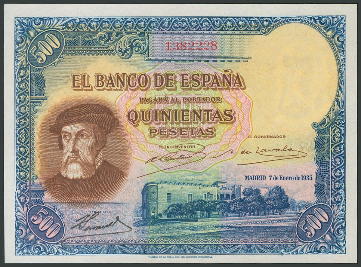 500 Pesetas. 7 de Enero de 1935. Sin serie. (Edifil 2017: 365). Conserva su apresto original. Raro. SC.
