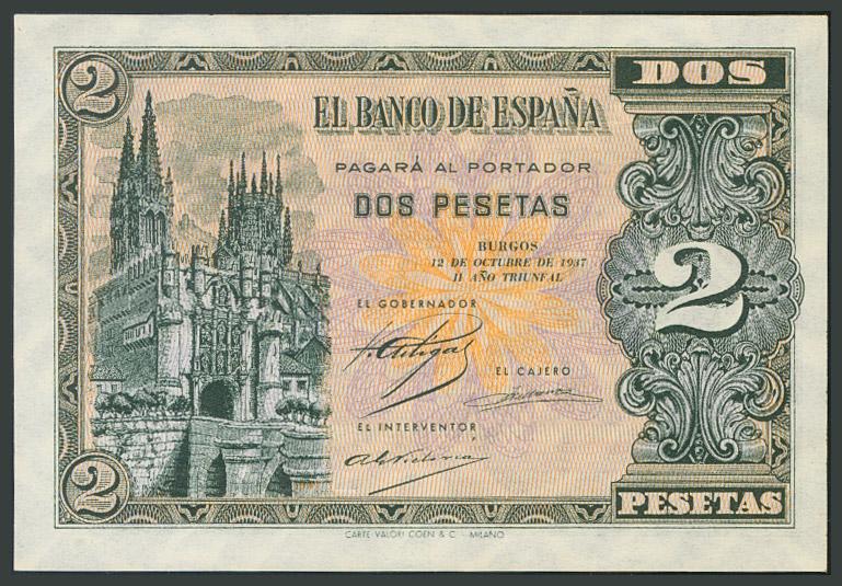 2 Pesetas. 12 de Octubre de 1937. Banco de España, Burgos. Serie A. (Edifil 2017: 426). Conserva su apresto original. SC.