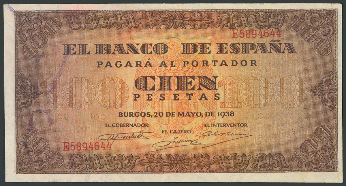 100 Pesetas. 20 de Mayo de 1938. Banco de España, Burgos. Serie E. (Edifil 2017: 432a). EBC.