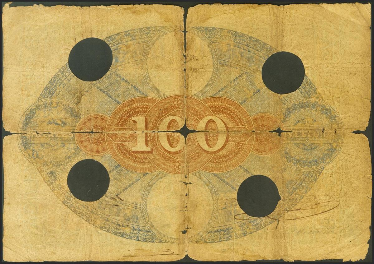 100 Reales. 24 de Septiembre de 1856. Banco de Málaga, impreso por MacLure & MacDonald, en Londres. Sin serie y con 4 taladros (como la mayoría de los pocos ejemplares que se conocen, especialmente los que circularon y no son pruebas). (Edifil 2021: 108). Extraordinariamente raro. RC-.