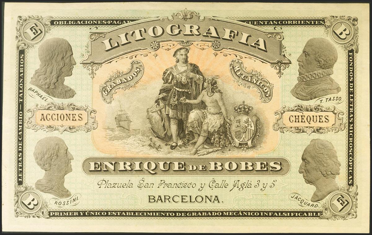 (1890ca). Octavilla Publicitaria de la imprenta litográfica Enrique Bobes, de Barcelona, en la que se presenta como primer y único establecimiento de grabado mecánico infalsificable, adornado con grabados, bustos y firmas, etc. Pieza de enorme espectacularidad y belleza en un altísimo estado de conservación.