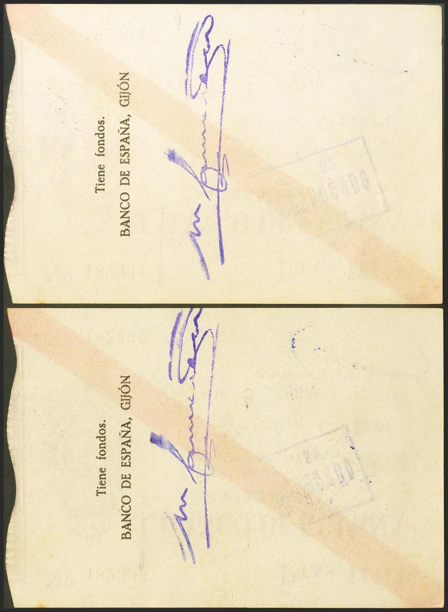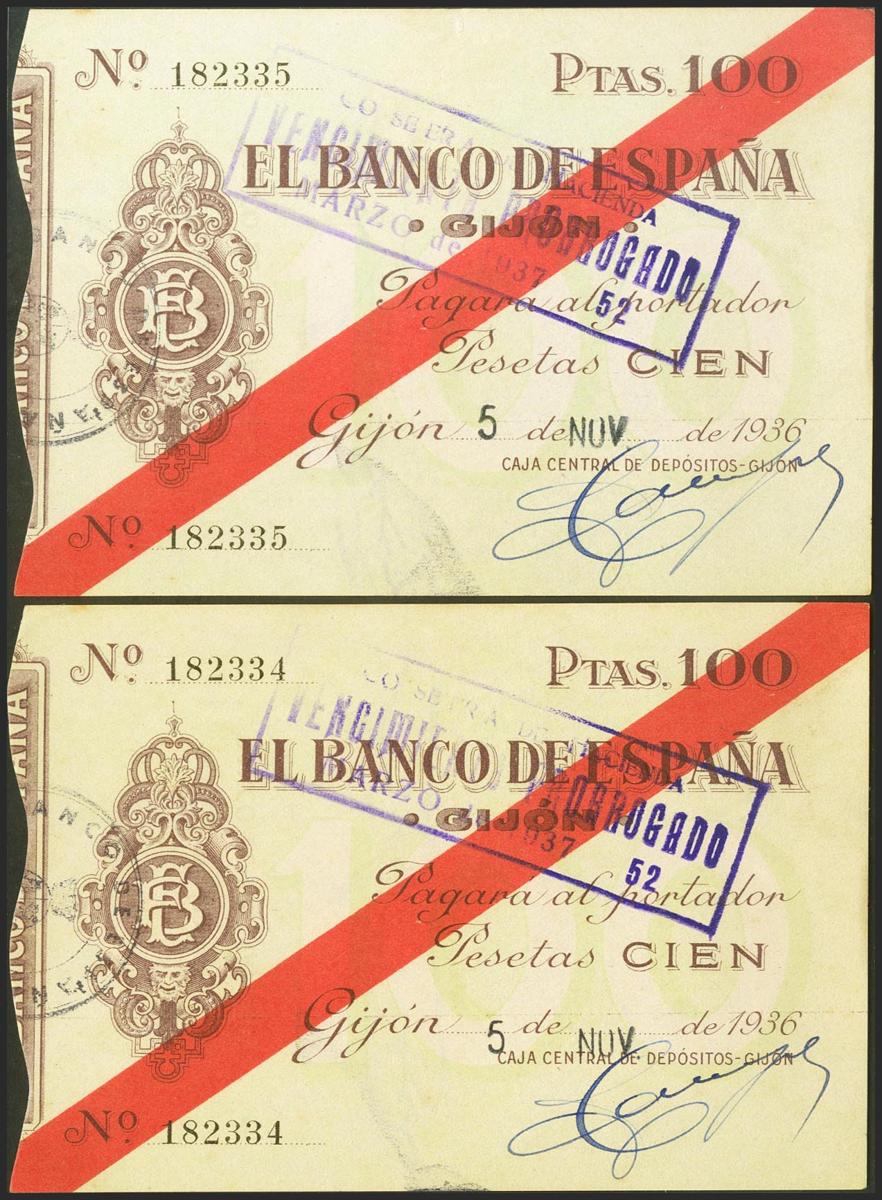 100 Pesetas. 5 de Noviembre de 1936. Sucursal de Gijón. Pareja correlativa. Sin serie. (Edifil 2021: 384). Rarísima pareja, especialmente en esta excepcional calidad para este billete, que siempre está en calidades bajas. SC- (posiblemente nos encontremos ante una pareja sin circular, esta opinión debe ser contrastada con el examen físico del billete).