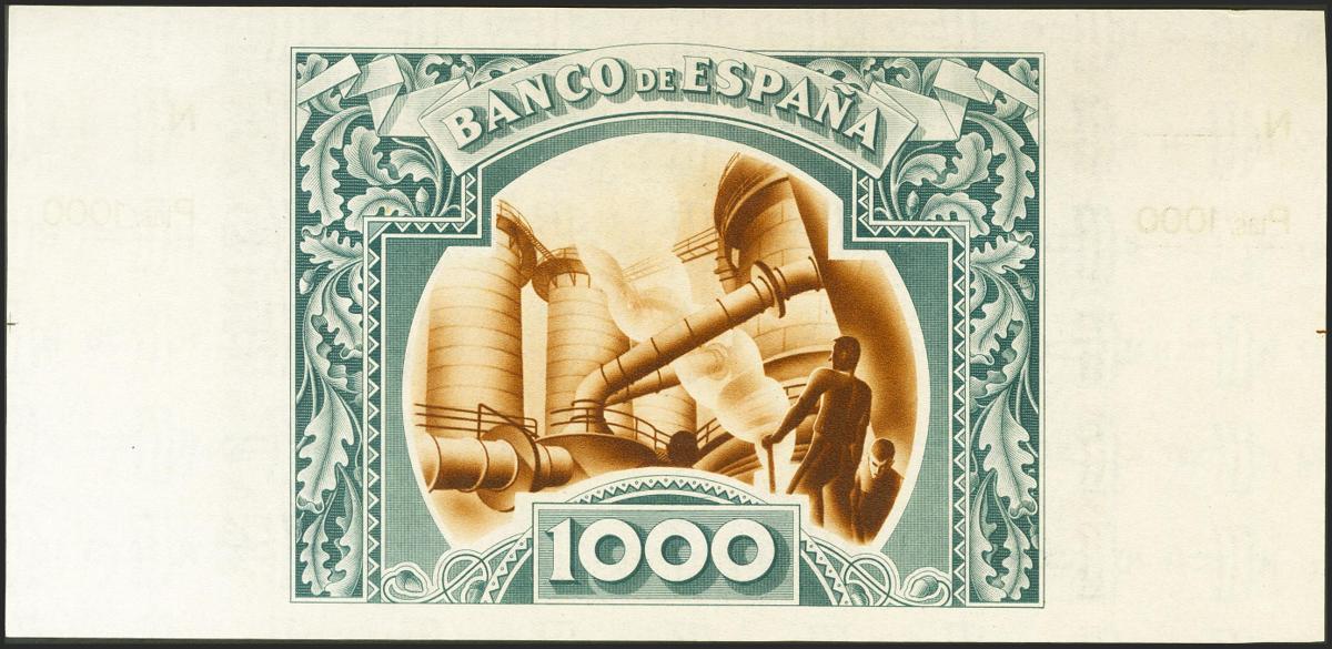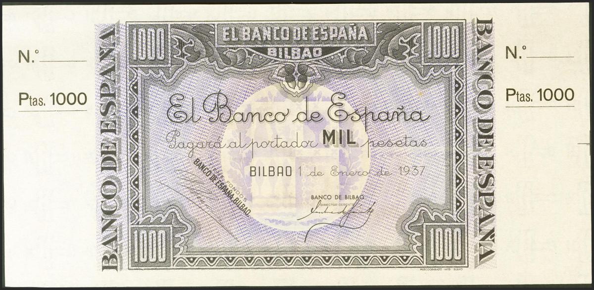 1000 Pesetas. 1 de Enero de 1937. Sucursal de Bilbao, antefirma Banco de Bilbao. No emitido, sin serie y sin numeración, con ambas matrices. (Edifil 2021: NE27a). Apresto original. SC-.