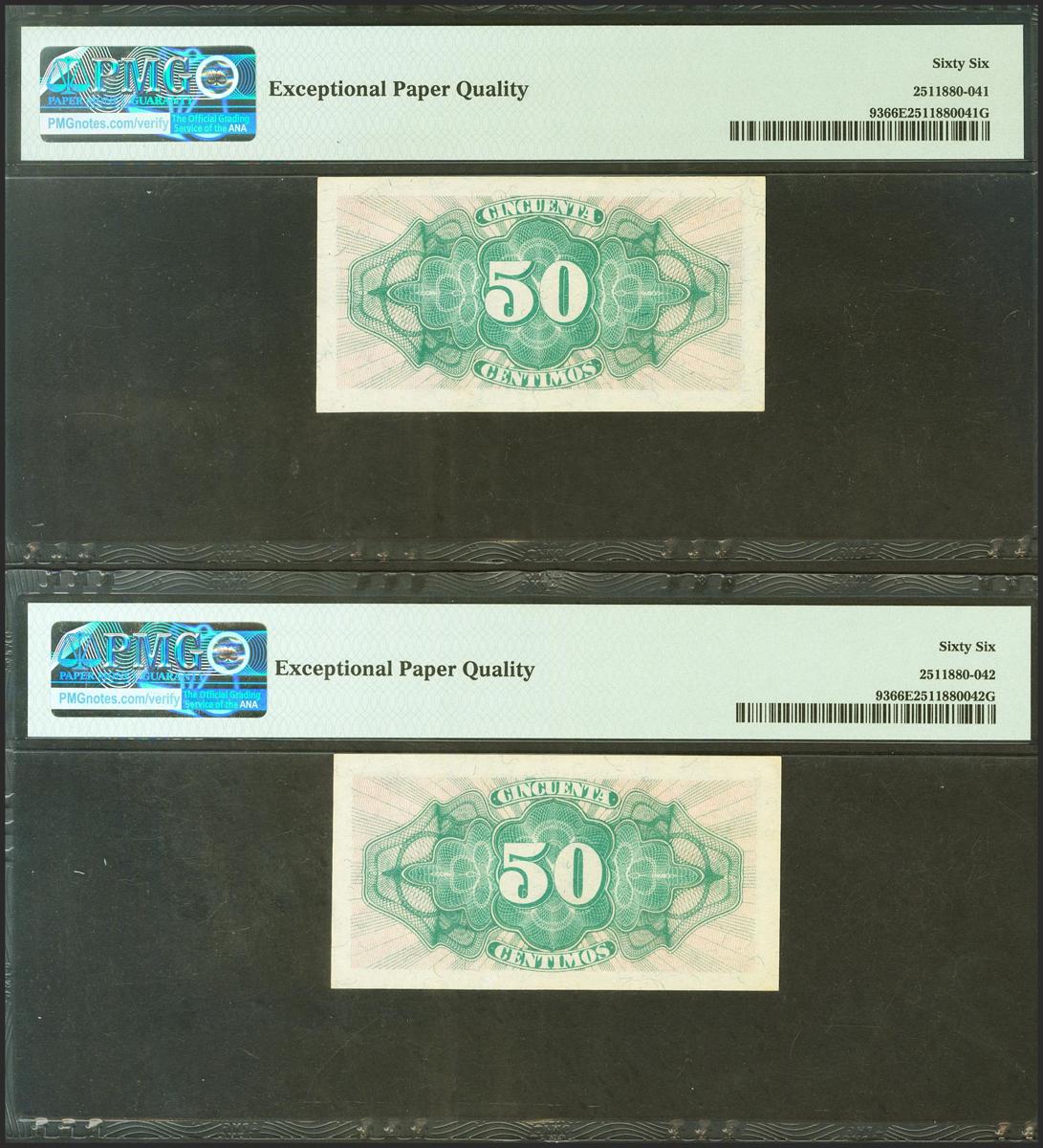 50 Céntimos. 1937. Ministerio de Hacienda. Pareja correlativa. Serie C, última serie emitida. (Edifil 2021: 391a, Pick: 93). Inusual en esta excepcional calidad, apresto original. SC. Encapsulados PMG66EPQ, ambos.