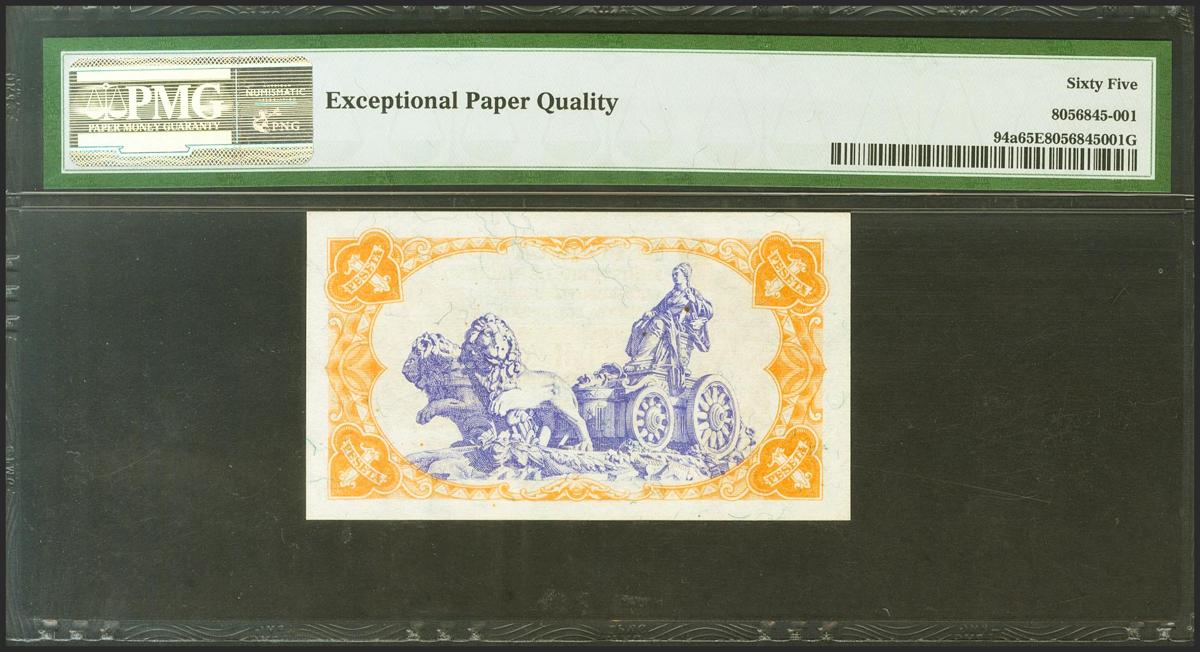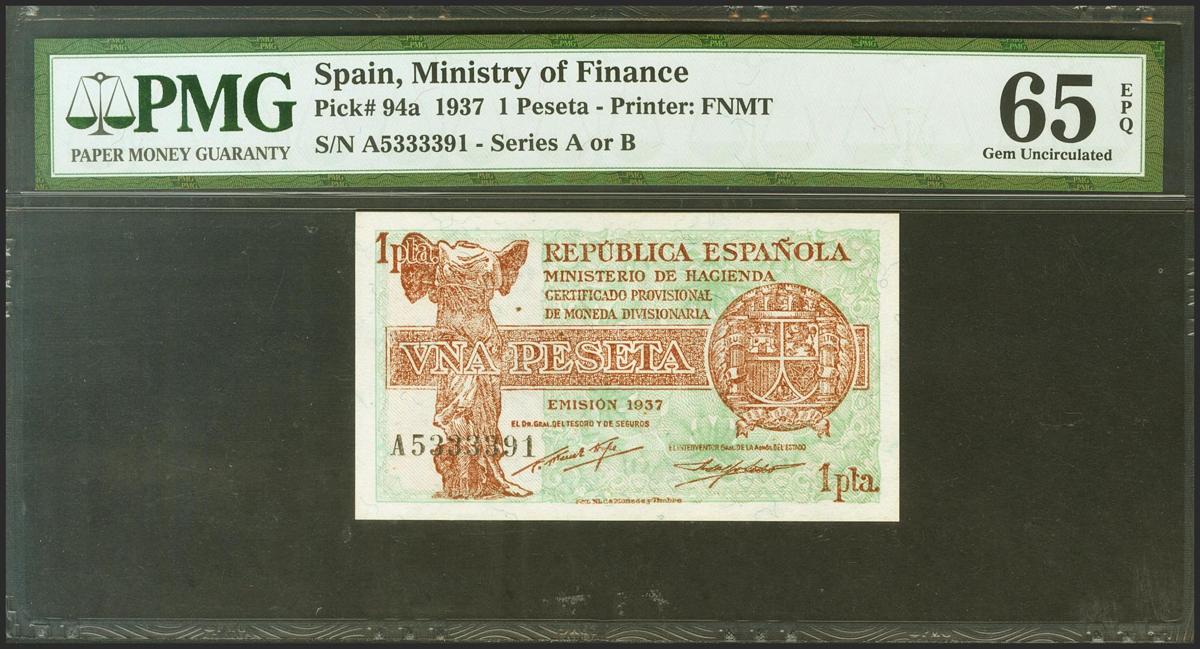 1 Peseta. 1937. Ministerio de Hacienda. Serie A. (Edifil 2021: 392, Pick: 94a). Apresto original. SC. Encapsulado PMG65EPQ.