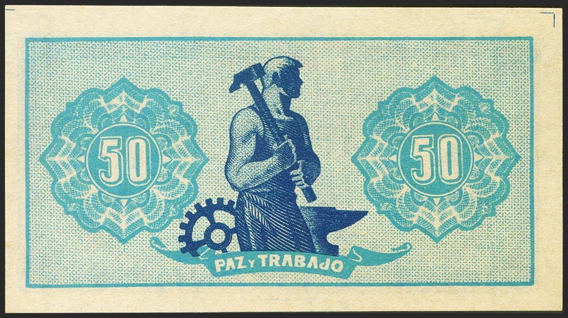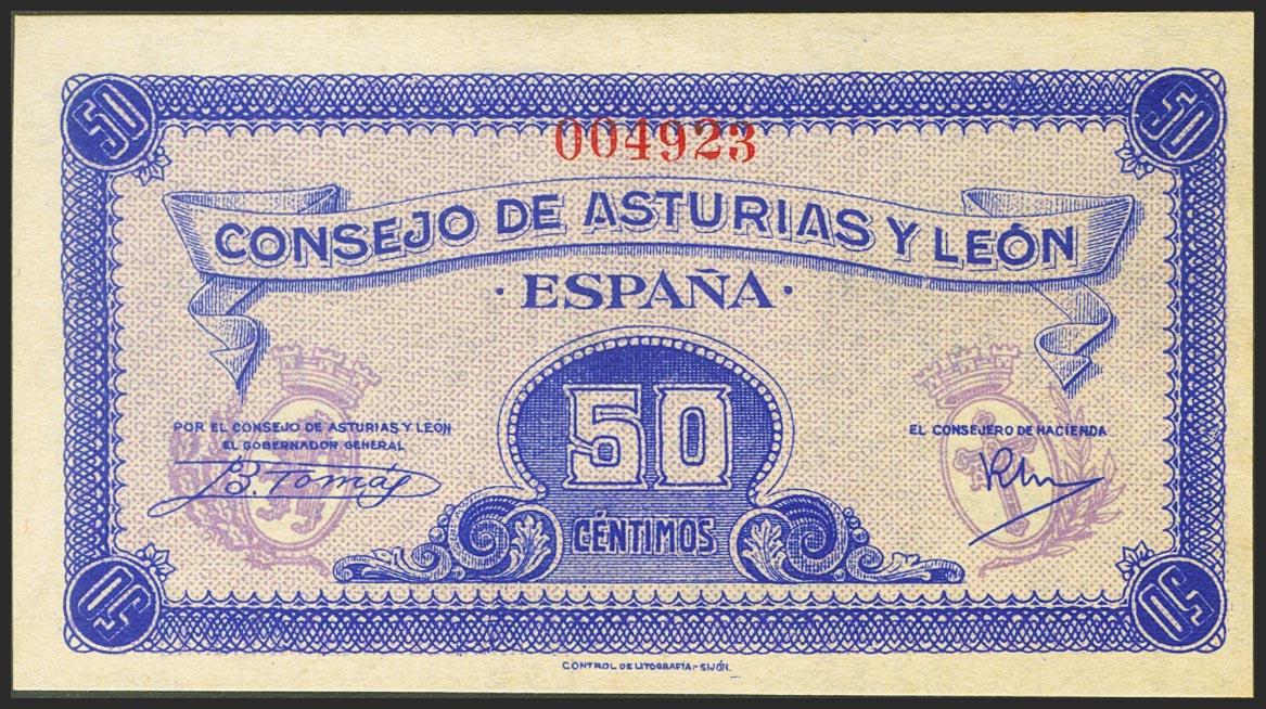 50 Céntimos. 1937. Asturias y León. Sin serie y numeración baja. (Edifil 2021: 396). Muy raro en esta calidad, apresto original. SC-.