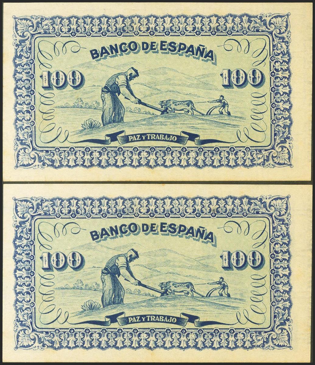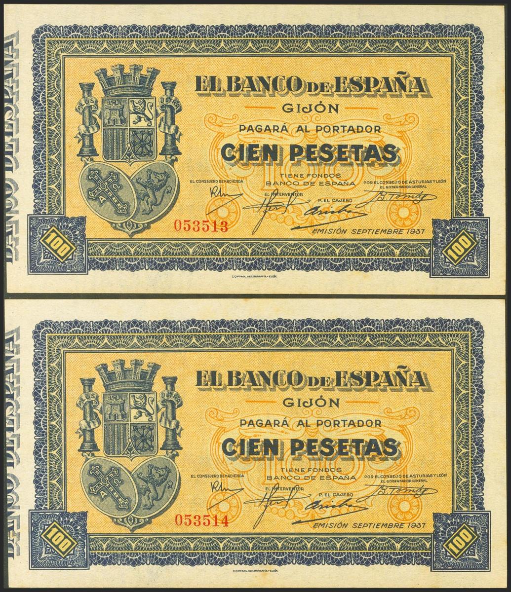 100 Pesetas. Septiembre 1937. Pareja correlativa. Asturias y León. Sin serie. (Edifil 2021: 399). Inusual, apresto original. SC.