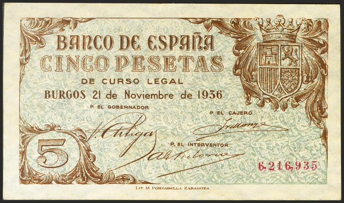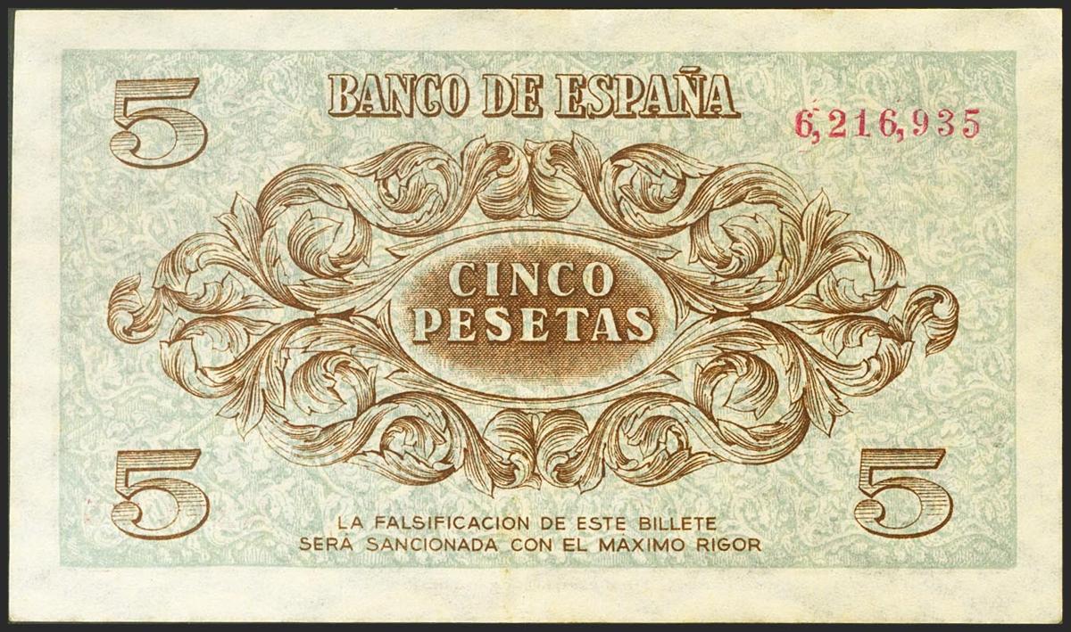 5 Pesetas. 21 de Noviembre de 1936. Sin serie. (Edifil 2021: 417). Inusual en esta conservación, conserva todo su apresto original, el doblez central sólo puede ser apreciado por ojos muy experimentados. EBC++.