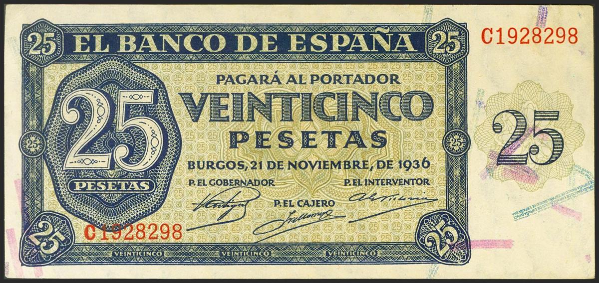25 Pesetas. 21 de Noviembre de 1936. Serie C. (Edifil 2021: 419a). Conserva todo su apresto original. SC-.