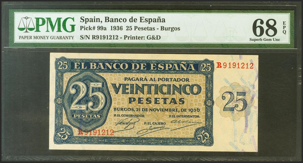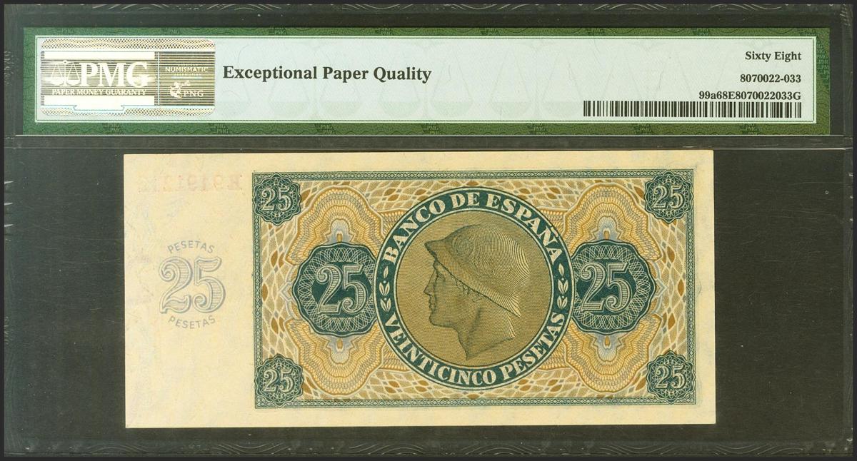 25 Pesetas. 21 de Noviembre de 1936. Serie R. (Edifil 2021: 419a, Pick: 99a). Rarísimo en esta excepcional calidad, apresto original. Encapsulado PMG68EPQ.