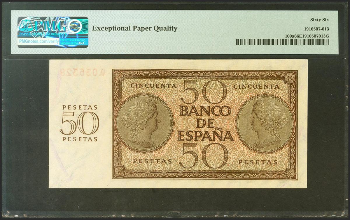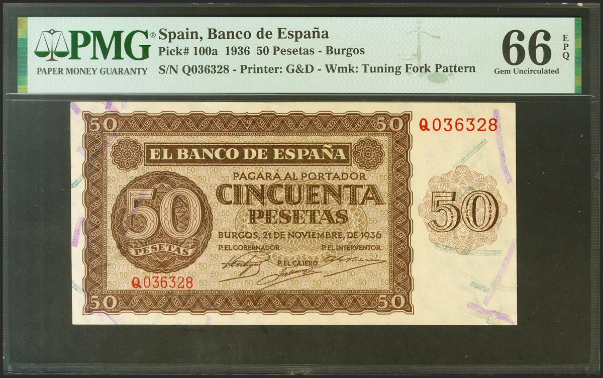 50 Pesetas. 21 de Noviembre de 1936. Serie Q. (Edifil 2021: 420a). Raro en esta excepcional calidad, apresto original. SC. Encapsulado PMG66EPQ.