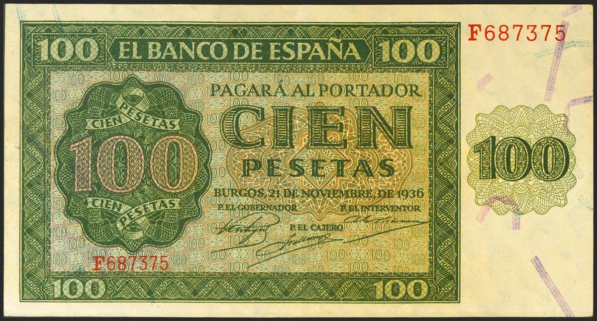 100 Pesetas. 21 de Noviembre de 1936. Serie F. (Edifil 2021: 421a). Conserva gran parte de su apresto original. EBC.