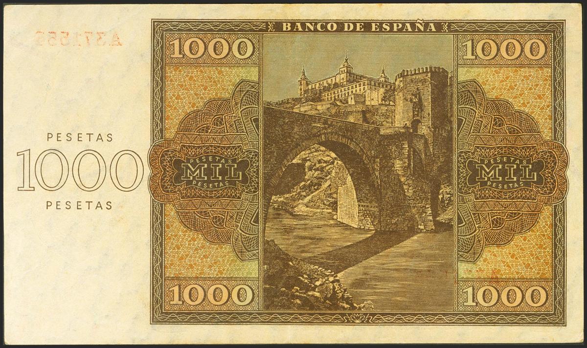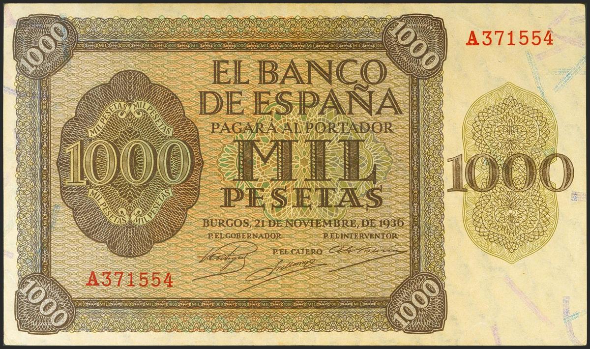 1000 Pesetas. 21 de Noviembre de 1936. Serie A. (Edifil 2021: 423). Conserva parte de su apresto original. EBC-.
