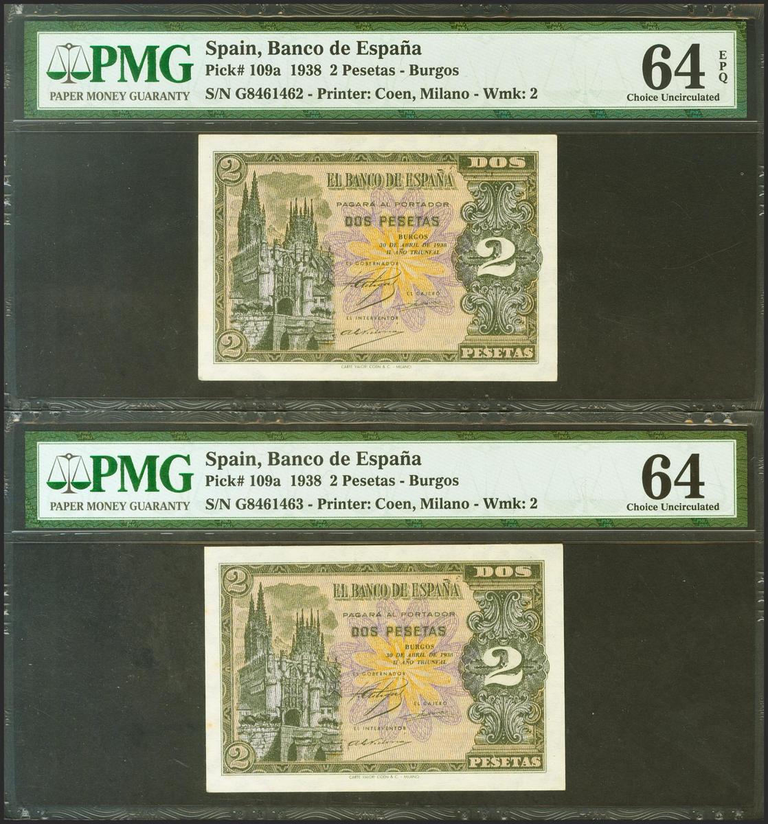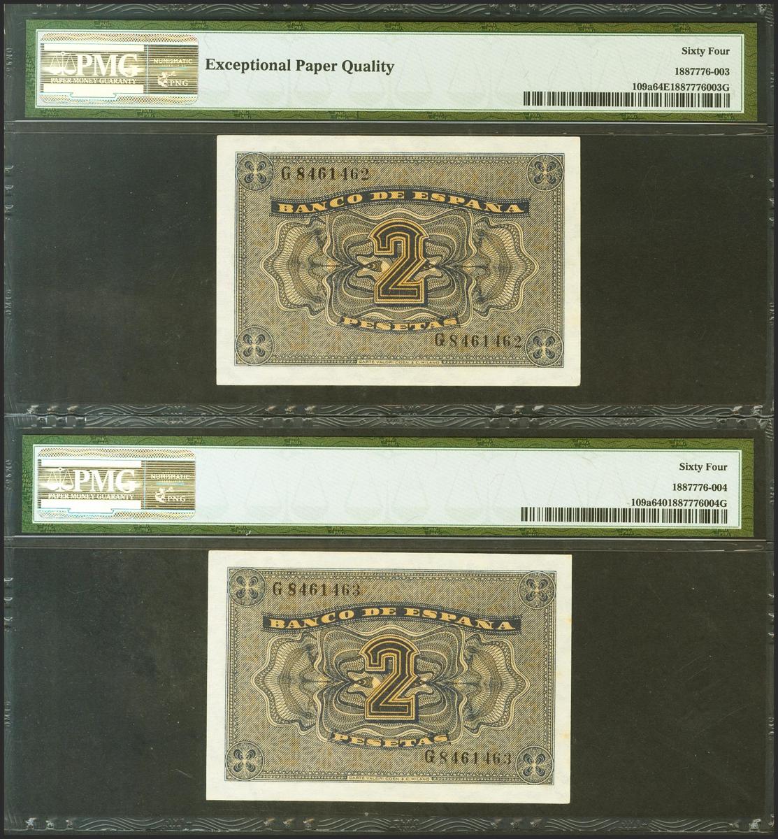2 Pesetas. 30 de Abril de 1938. Pareja correlativa. Serie G. (Edifil 2021:429a, Pick: 109a). SC. Encapsulados PMG64/64EPQ.