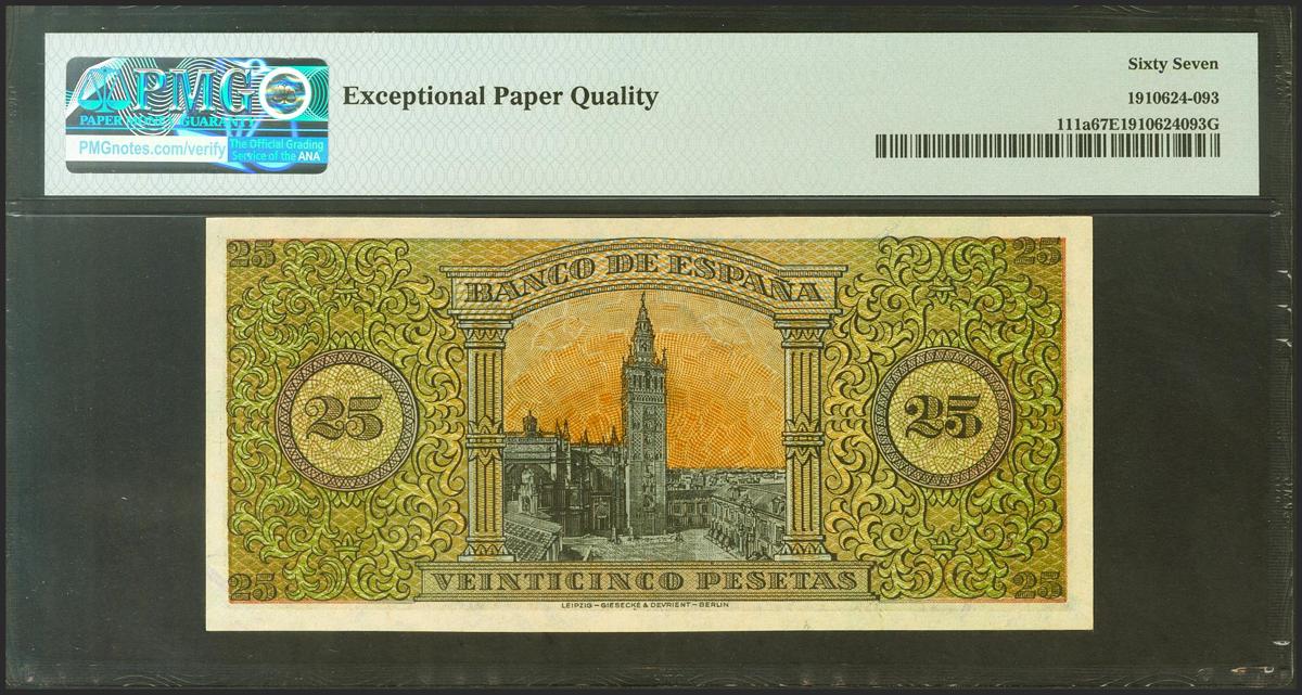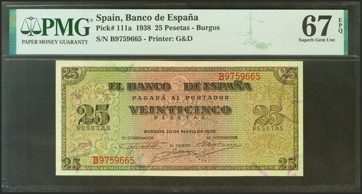 25 Pesetas. 20 de Mayo de 1938. Serie B. (Edifil 2021: 430a, Pick: 111a). Raro en esta excepcional calidad, apresto original. SC. Encapsulado PMG67EPQ.