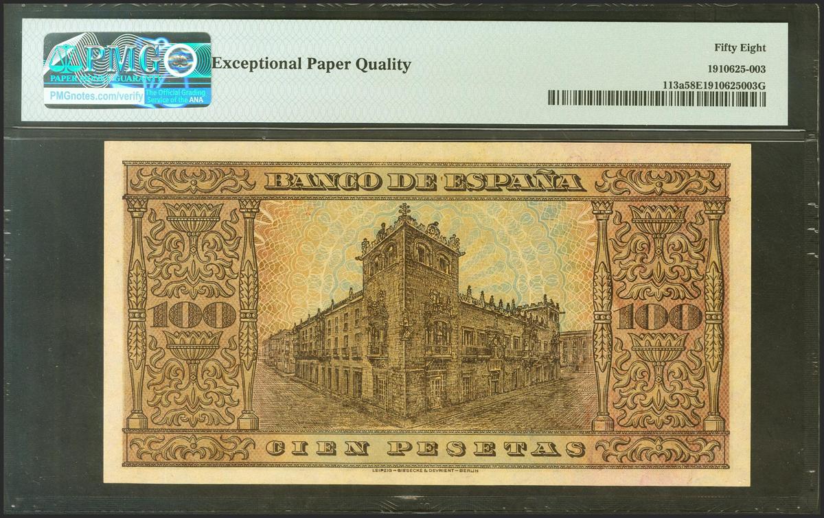 100 Pesetas. 20 de Mayo de 1938. Serie A. (Edifil 2021: 432, Pick: 113a). Apresto original. EBC+++. Encapsulado PMG58EPQ.