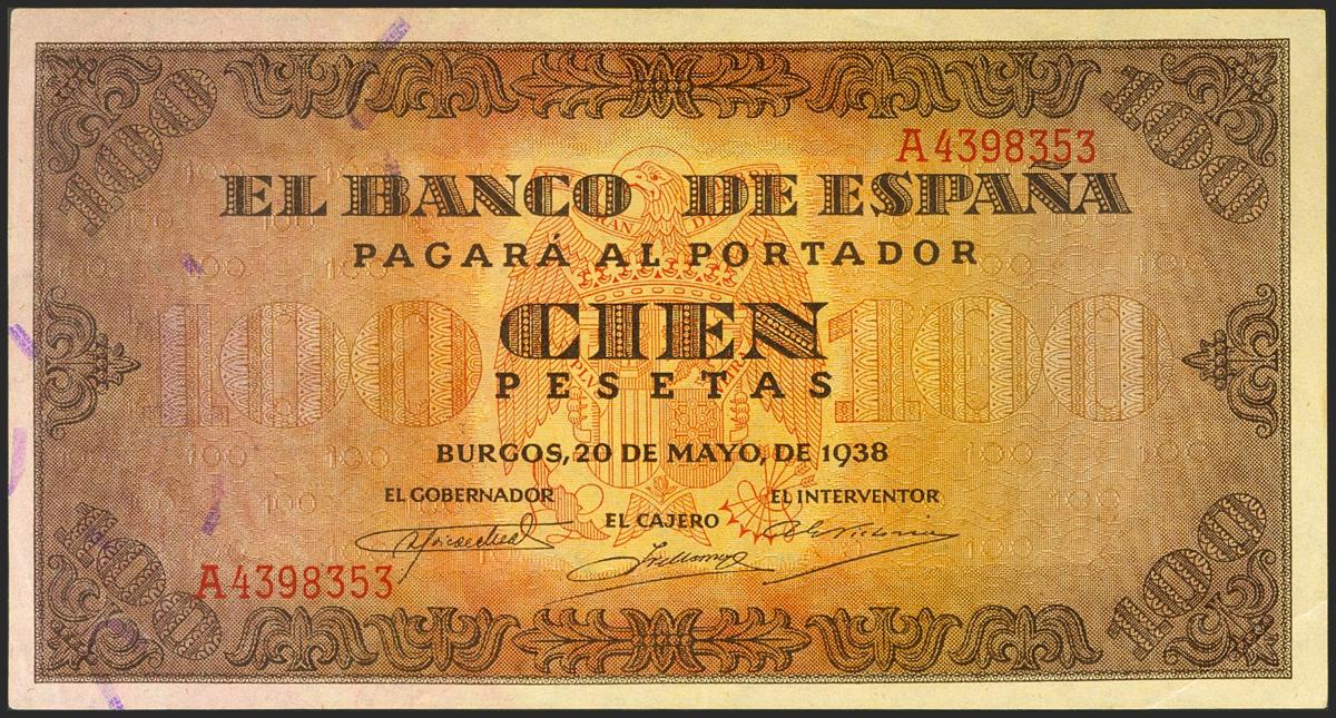 100 Pesetas. 20 de Mayo de 1938. Serie A. (Edifil 432). Conserva gran parte de su apresto original. EBC+.