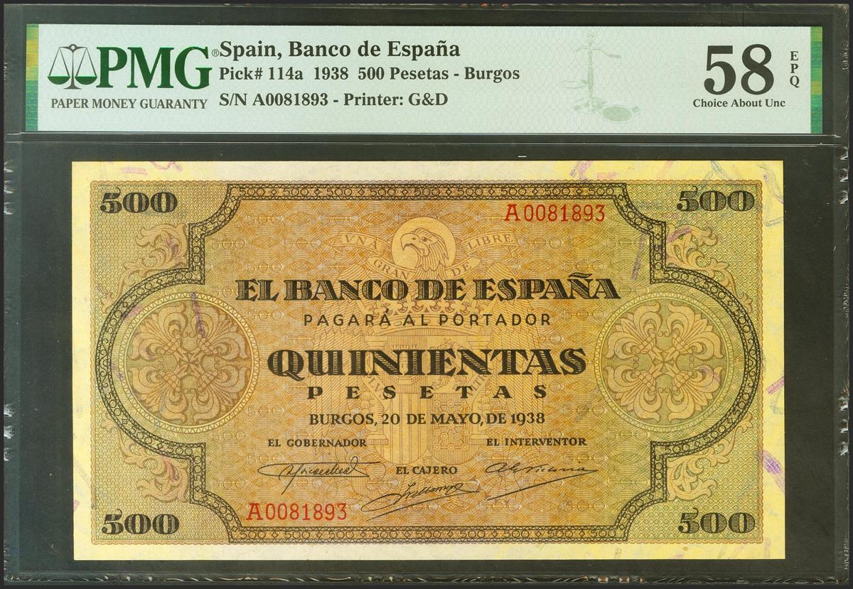 500 Pesetas. 20 de Mayo de 1938. Serie A. (Edifil 2021: 433, Pick: 114a). Inusual en esta calidad, apresto original. EBC+. PMG58EPQ.