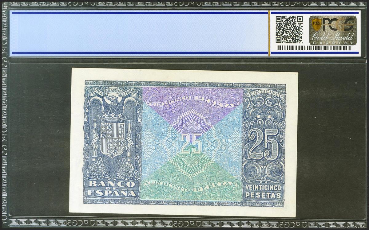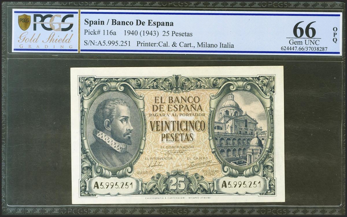 25 Pesetas. 9 de Enero de 1940. Serie A. (Edifil 2021: 436, Pick: 116a). Inusual en esta excepcional calidad, apresto original. SC. Encapsulado PCGS66OPQ.