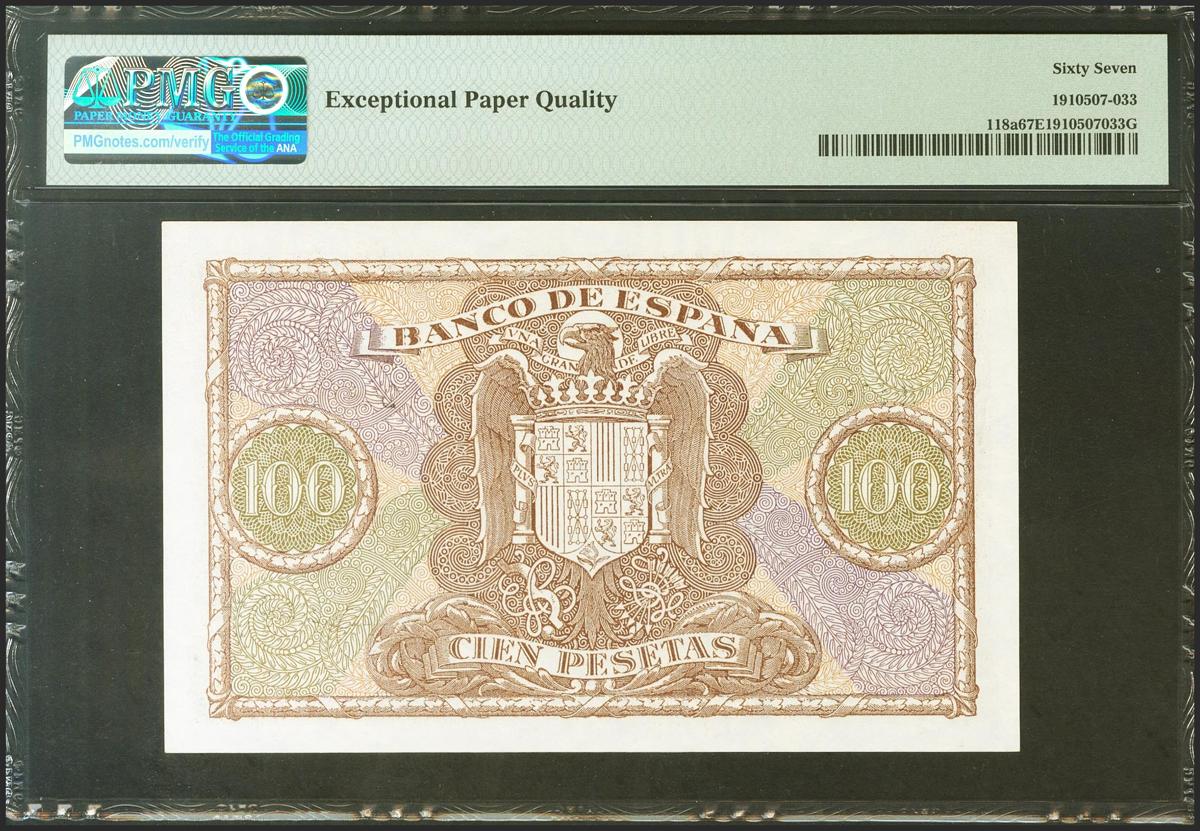 100 Pesetas. 9 de Enero de 1940. Serie D. (Edifil 2021: 438a). Extraordinariamente raro en esta excepcional calidad, conserva todo su apresto original. SC. Encapsulado PMG67EPQ.