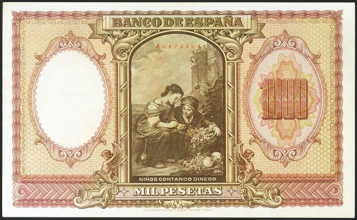 1000 Pesetas. 9 de Enero de 1940. Serie A. (Edifil 2021: 440). Conserva parte de su apresto original, billete de gran espectacularidad. EBC.
