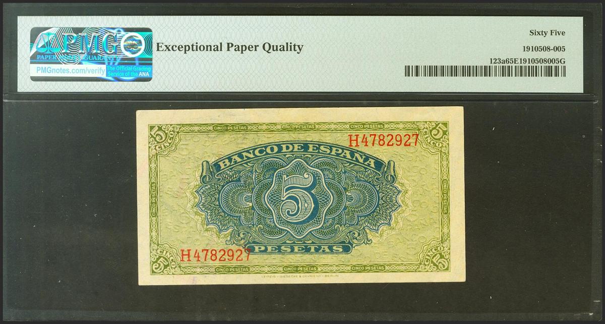 5 Pesetas. 4 de Septiembre de 1940. Serie H. (Edifil 2021: 443a). Inusual en esta conservación con todo su apresto original. SC. Encapsulado PMG65EPQ.