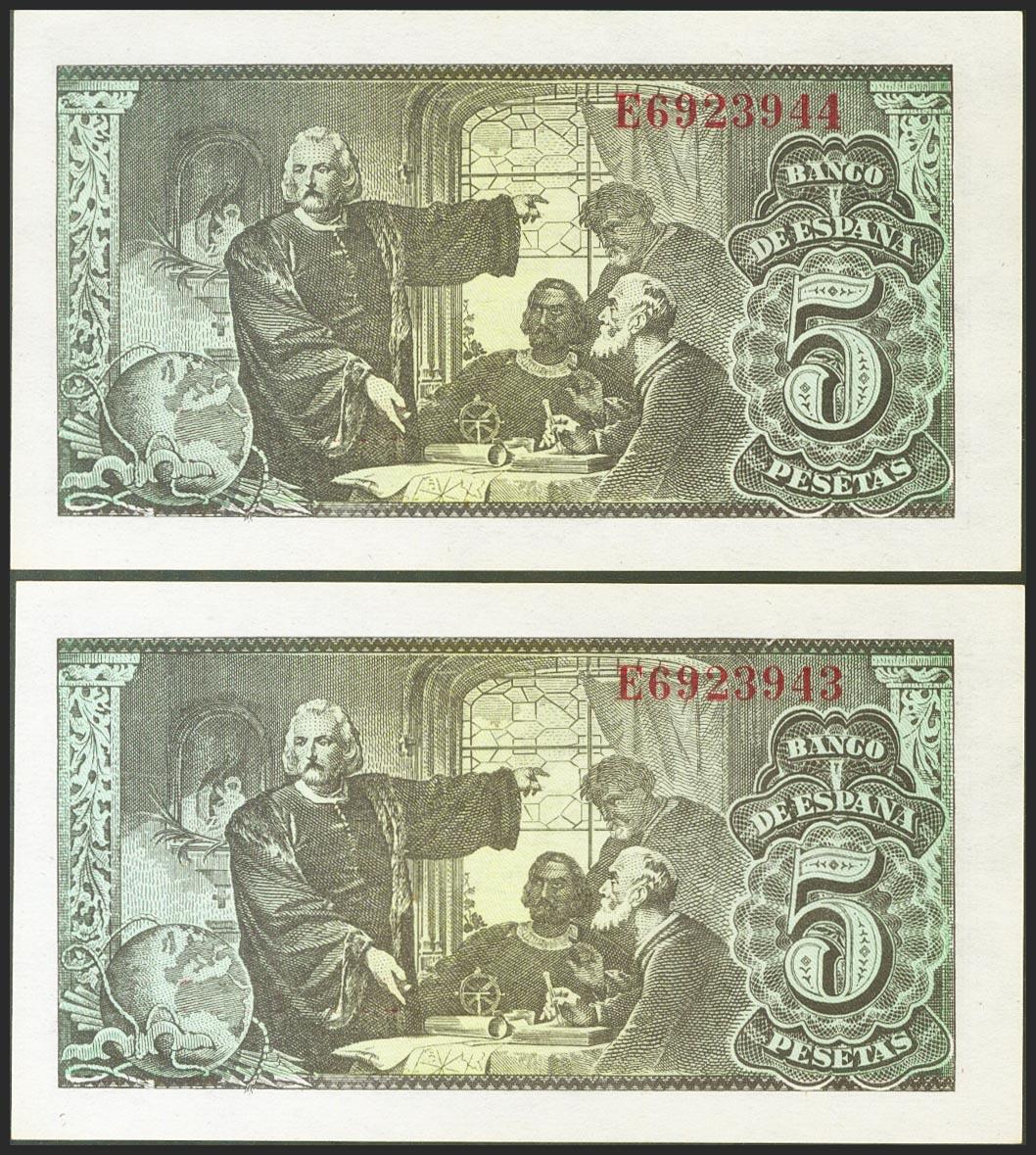1 Peseta. 13 de Febrero de 1943. Pareja correlativa. Serie E. (Edifil 2021: 446a). Conserva todo su apresto original. SC-.