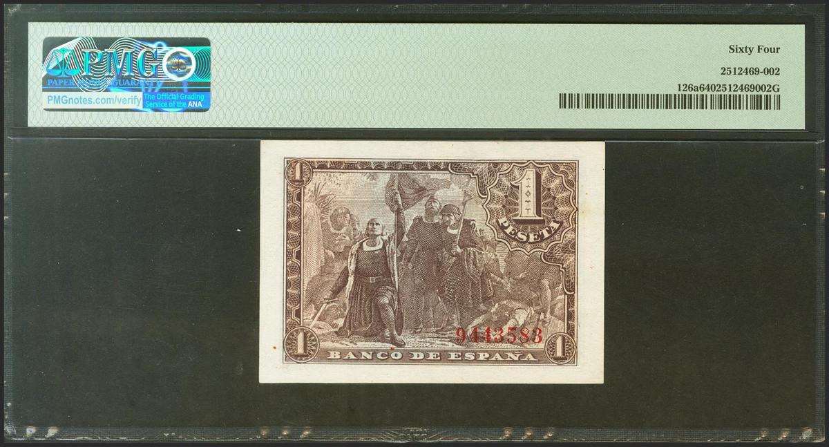 1 Peseta. 21 de Mayo de 1943. Sin serie. (Edifil 2021: 447, Pick: 126a). SC. Encapsulado PMG64.
