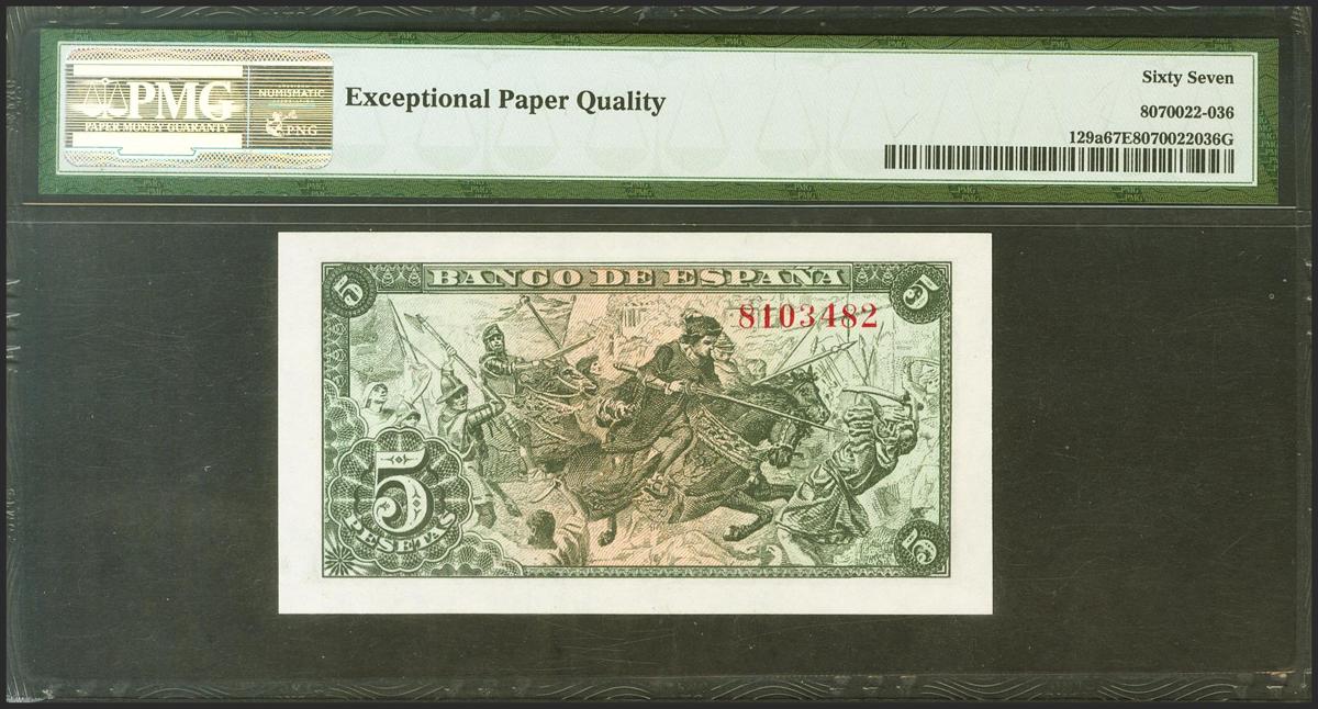 5 Pesetas. 15 de Junio de 1945. Sin serie. (Edifil 2021: 449a, Pick: 129a). Raro en esta excepcional calidad, apresto original. SC. Encapsulado PMG67EPQ.