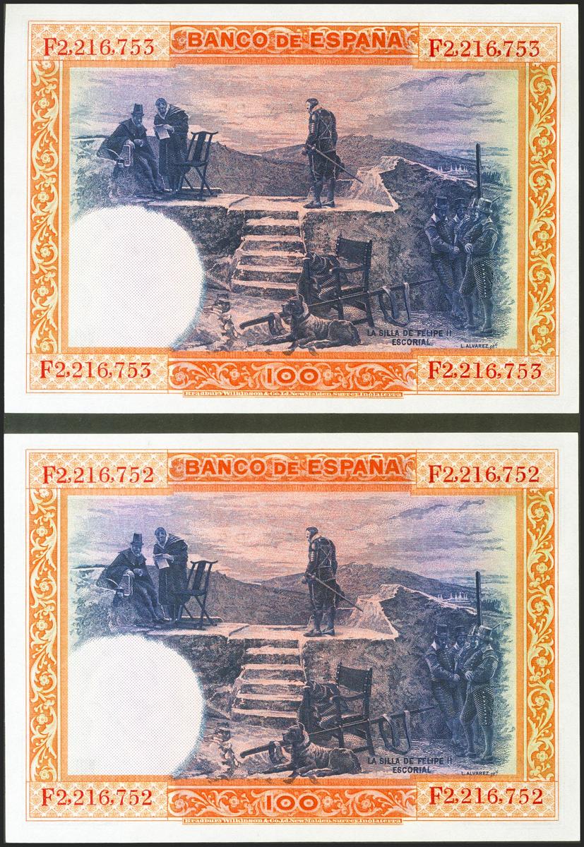 100 Pesetas. 1 de Julio de 1925. Pareja correlativa. Serie F. (Edifil 2021: 350). Conserva todo su apresto original. SC.