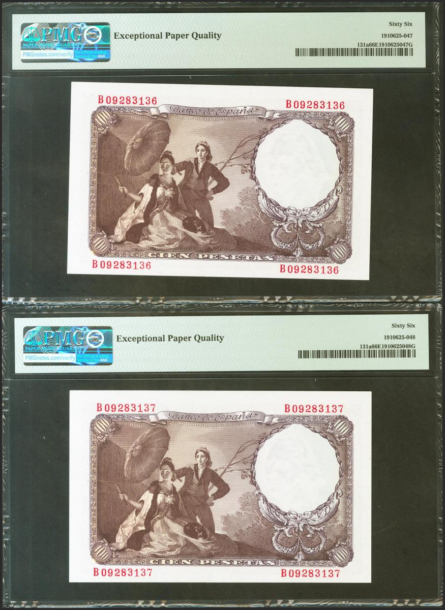100 Pesetas. 19 de Febrero de 1946. Pareja correlativa. Serie B. (Edifil 2017: 451b). Raro en esta excepcional calidad, apresto original. SC. Encapsulados PMG66EPQ, ambos.