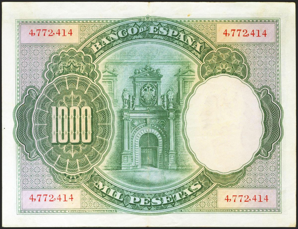 1000 Pesetas. 1 de Julio de 1925. Sin serie y numeración posterior a 3646000. (Edifil 2021: 351). Conserva parte del apresto original. EBC.