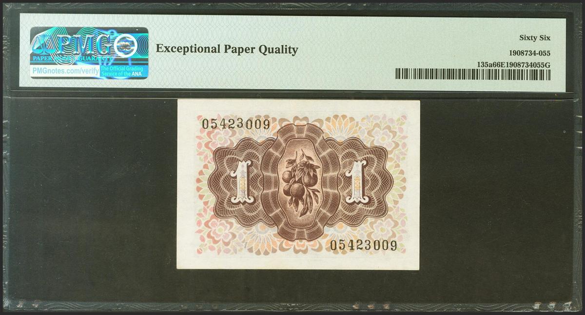 1 Peseta. 19 de Junio de 1948. Sin serie. (Edifil 2021: 457, Pick: 135a). Raro en esta calidad, apresto original. SC. Encapsulado PMG66EPQ.