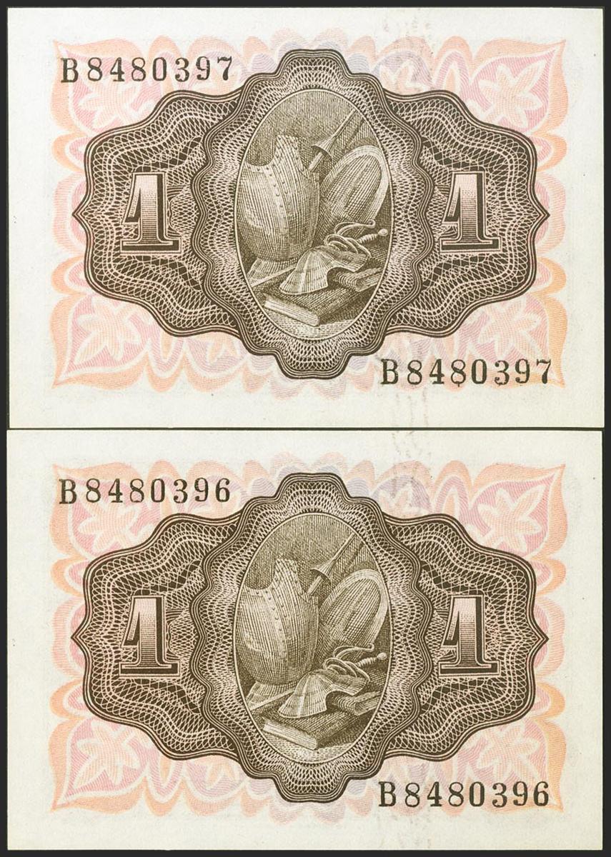 1 Peseta. 19 de Noviembre de 1951. Pareja correlativa. Serie B. (Edifil 2021: 461a). Apresto original. SC-.