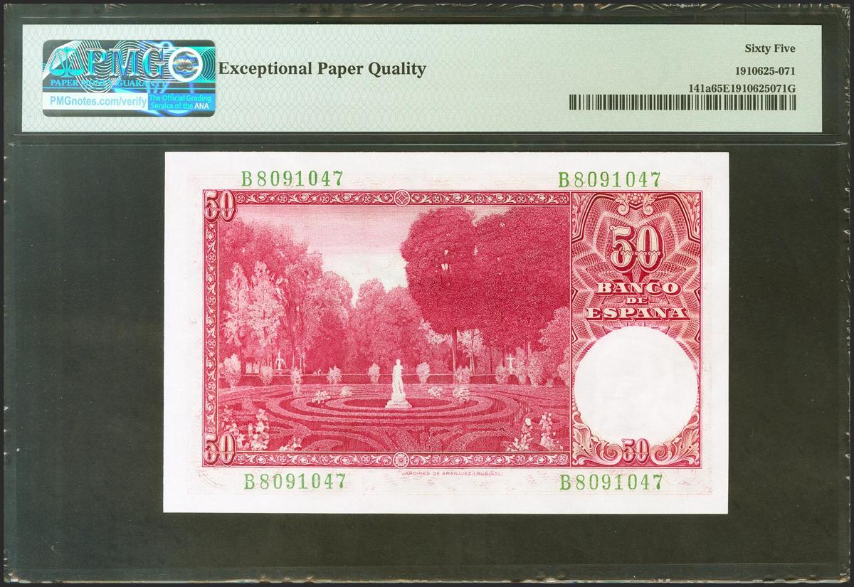 50 Pesetas. 31 de Diciembre de 1951. Serie B. (Edifil 2021: 462a, Pick: 141a). Inusual en esta calidad, apresto original. SC. Encapsulado PMG65EPQ.