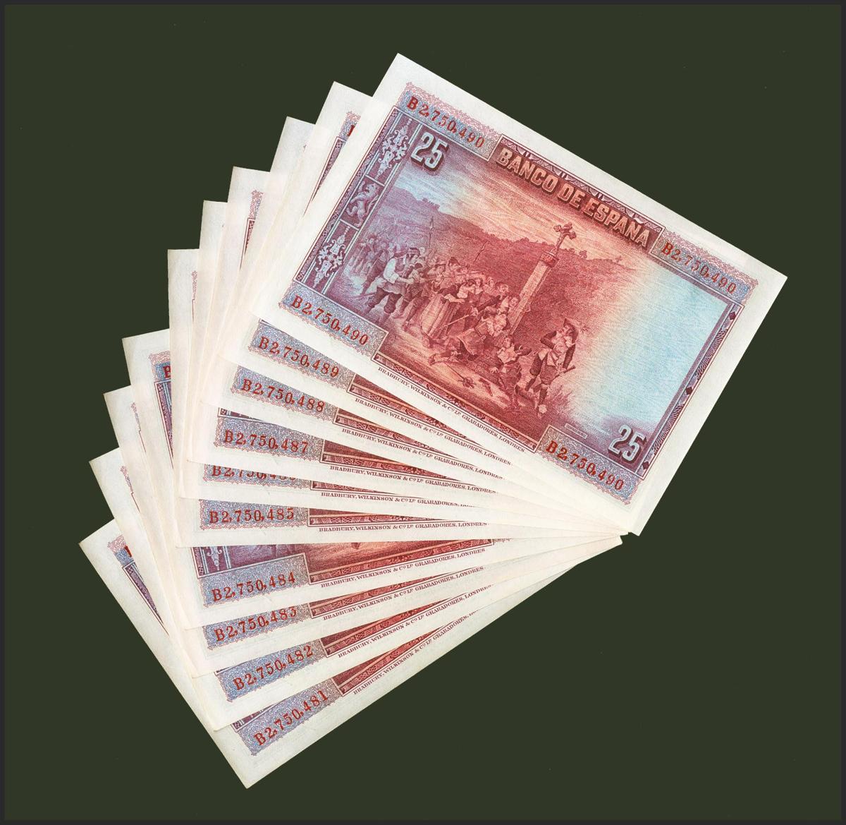 Precioso conjunto de 10 billetes correlativos de 25 Pesetas emitidos el 15 de Agosto de 1928 con la serie B (Edifil 2021: 353), conservando todo su apresto original. SC/SC-.