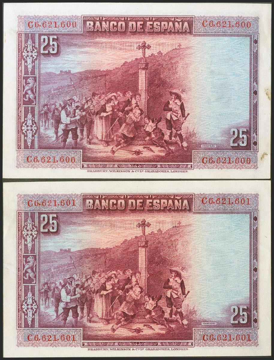 25 Pesetas. 15 de Agosto de 1928. Pareja correlativa. Serie C. (Edifil 2021: 353). Apresto original. SC-.