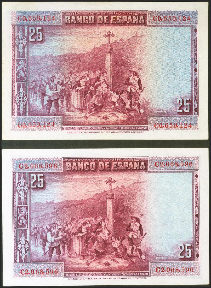 Conjunto de 2 billetes de 25 Pesetas emitidos el 15 de Agosto de 1928 con la serie C (Edifil 2021: 353), conservando gran parte del apresto original. SC--/SC.