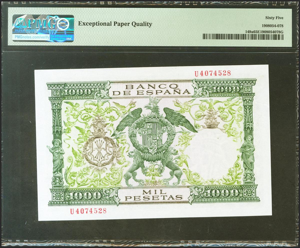 1000 Pesetas. 29 de Noviembre de 1957. Serie U. (Edifil 2021: 469b, Pick: 94a). Apresto original. SC. Encapsulado PMG65EPQ.