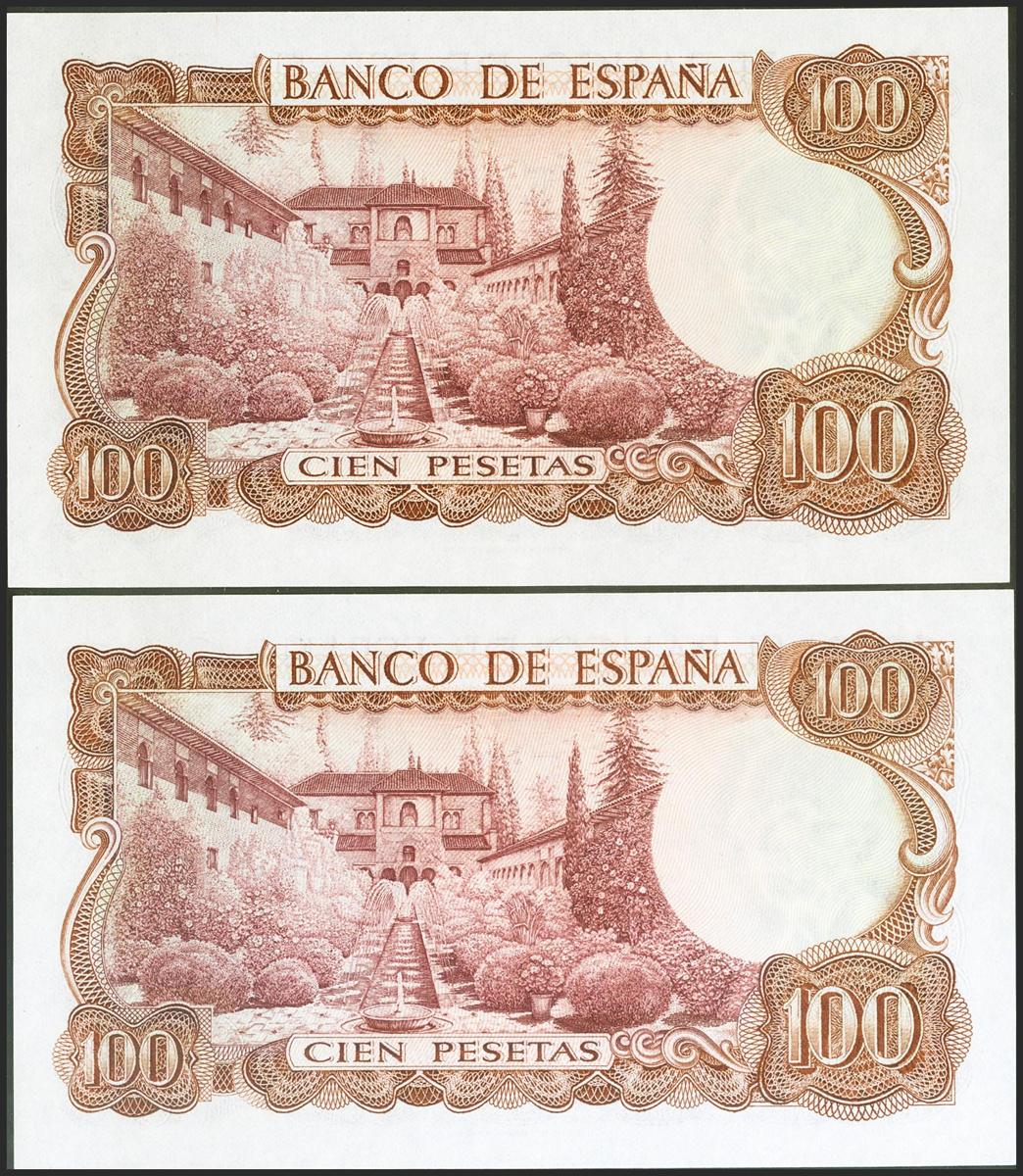 100 Pesetas. 17 de Noviembre de 1970. Pareja correlativa. Serie 7A. (Edifil 2021: 472c). Apresto original. SC.