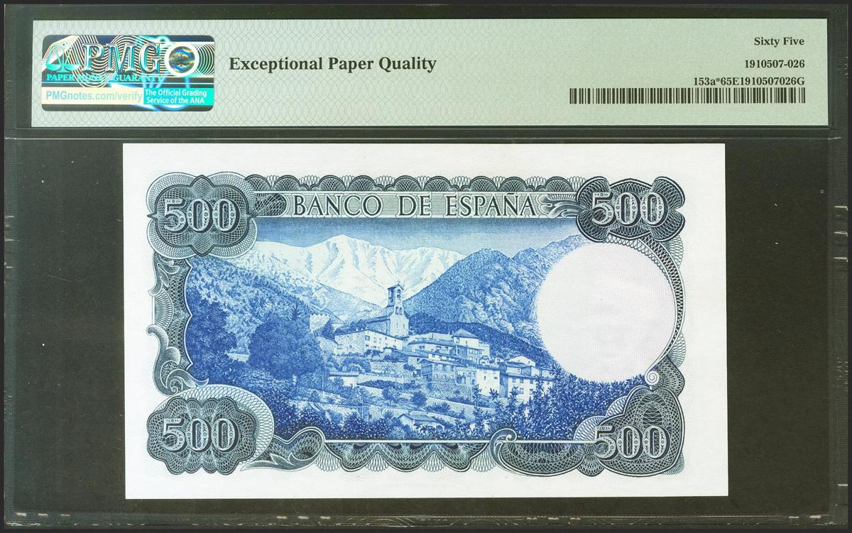500 Pesetas. 23 de Julio de 1971. Serie especial 9A. (Edifil 2021: 473b). Inusual en esta conservación, conserva todo su apresto original. Encapsulado PMG65EPQ.