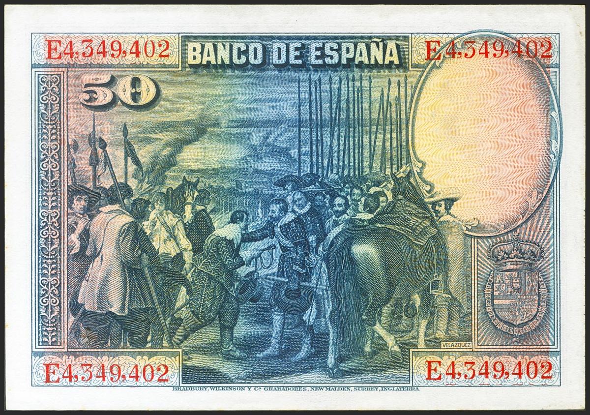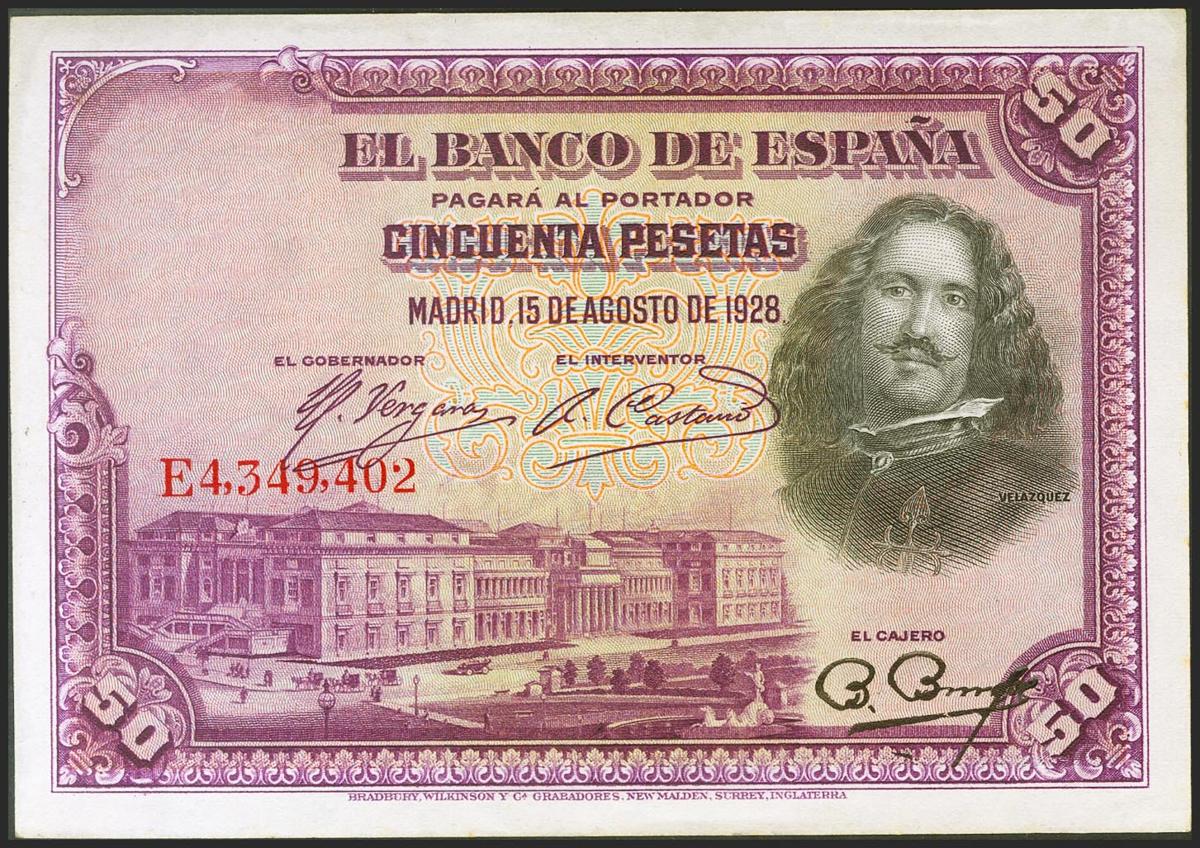 50 Pesetas. 15 de Agosto de 1928. Serie E. (Edifil 2021: 354). Conserva todo su apresto original. SC-.