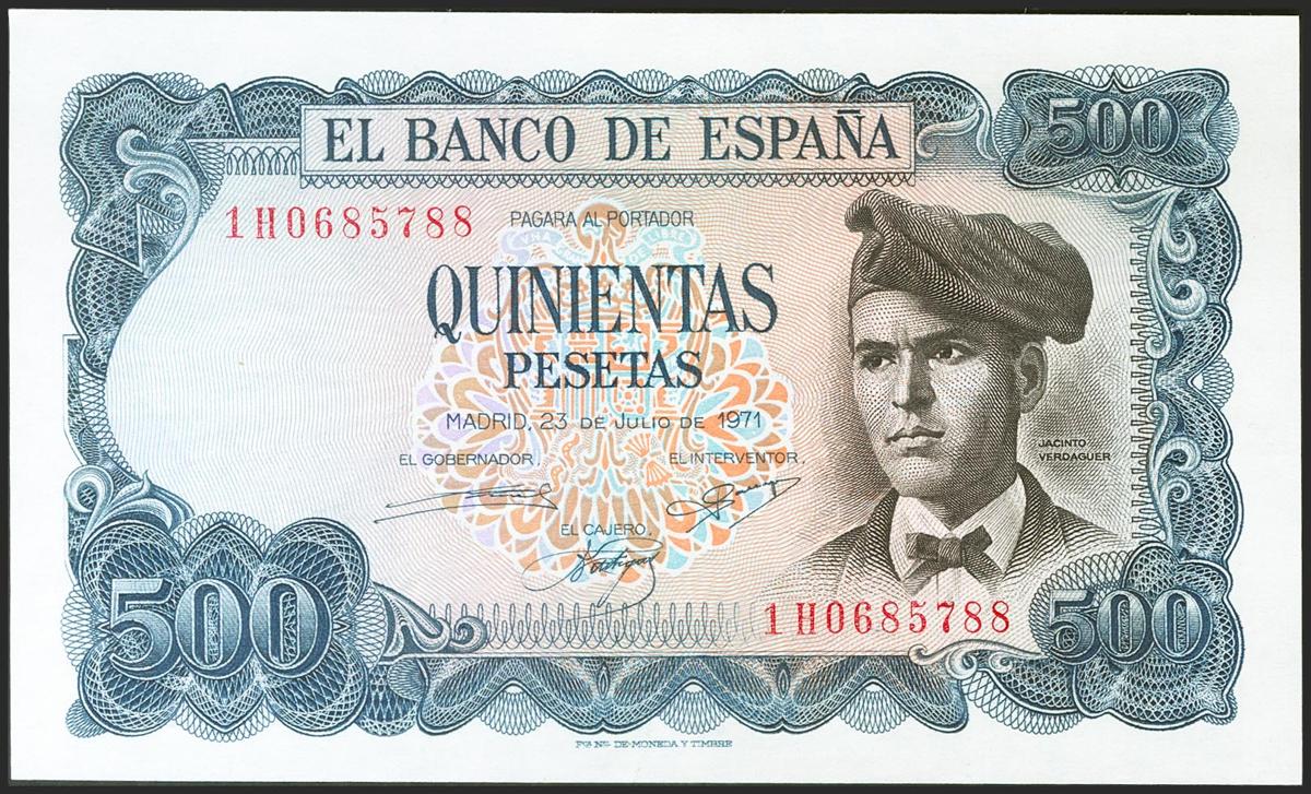 500 Pesetas. 23 de Julio de 1971. Serie 1H. (Edifil 2021: 473a). Conserva todo su apresto original. EBC+.