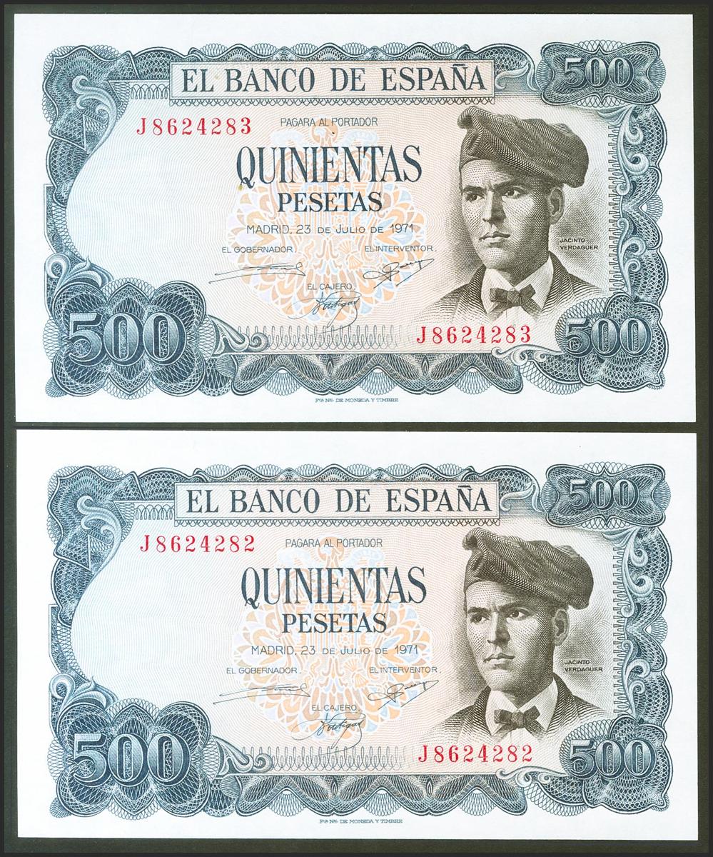 500 Pesetas. 23 de Julio de 1971. Pareja correlativa. Serie J. (Edifil 2021: 473a). Conserva todo su apresto original. SC.
