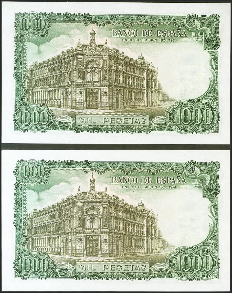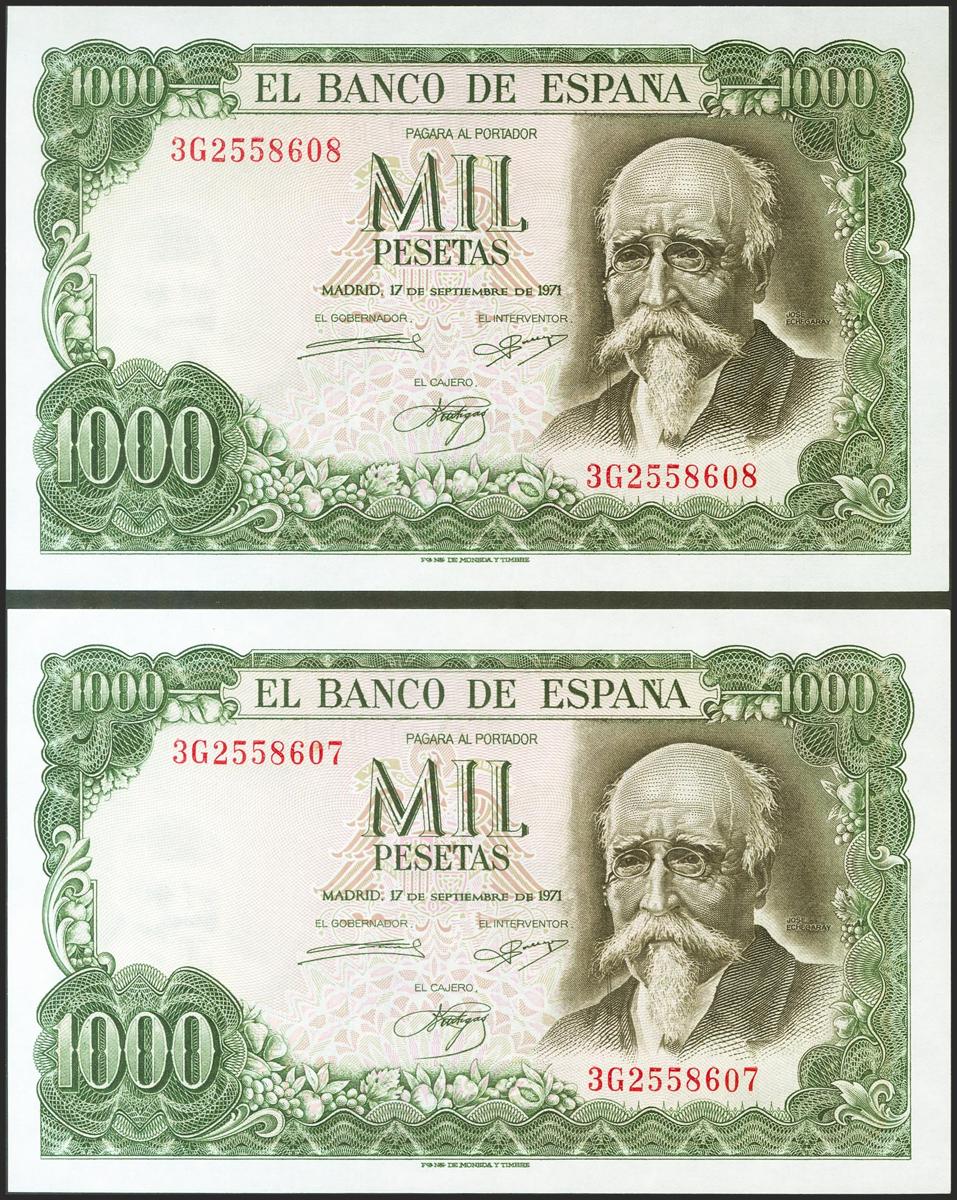 1000 Pesetas. 17 de Septiembre de 1971. Pareja correlativa. Serie 3G. (Edifil 2021: 474c). Conserva todo su apresto original. SC.