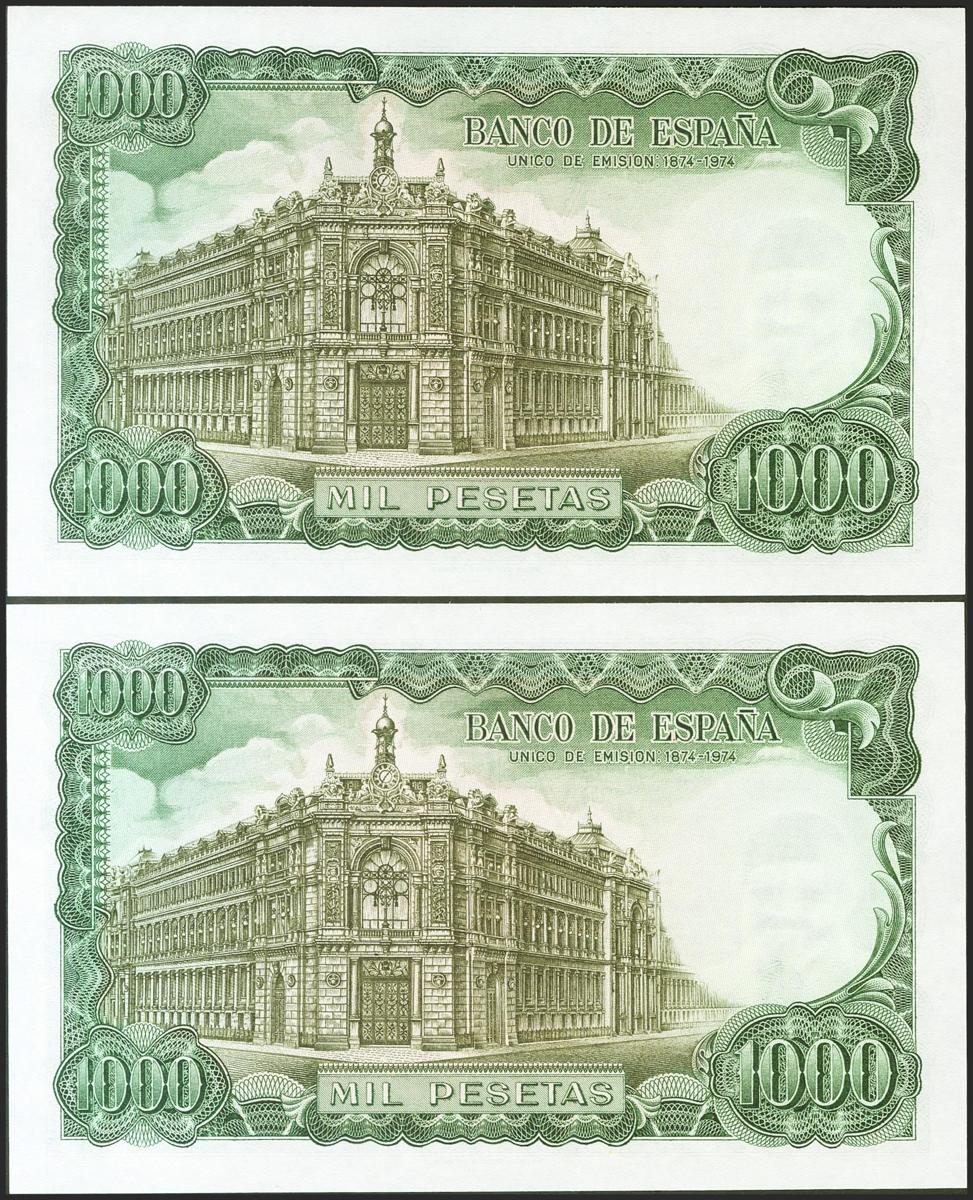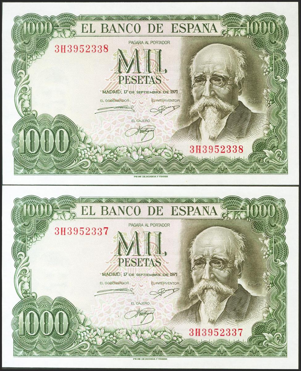 1000 Pesetas. 17 de Septiembre de 1971. Pareja correlativa. Serie 3H. (Edifil 2021: 474c). Conserva todo su apresto original. SC.