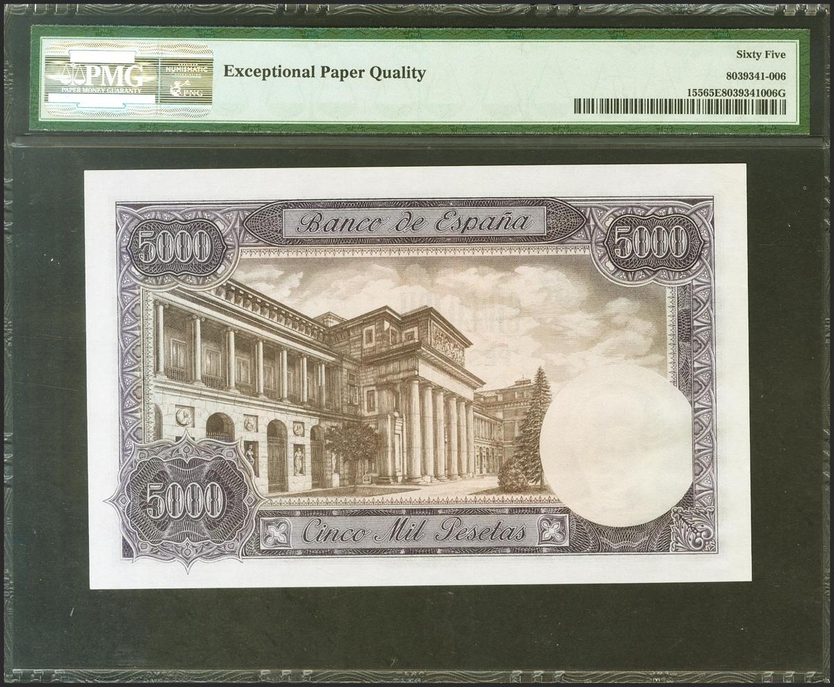 5000 Pesetas. 6 de Febrero de 1976. Sin serie y numeración muy baja. (Edifil 2021: 475, Pick: 155). Raro. SC. Encapsulado PMG65EPQ.