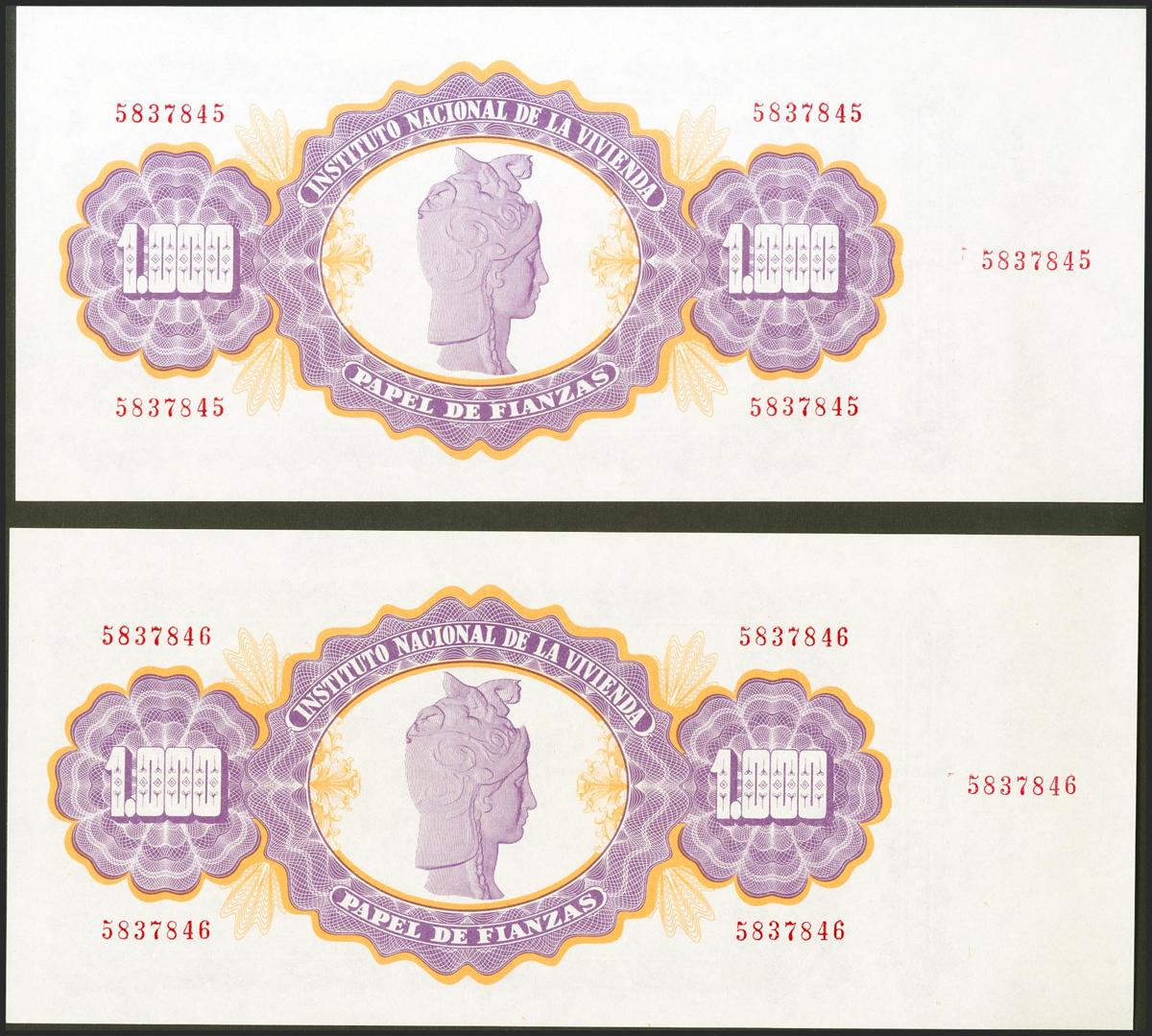 1000 Pesetas. 1 de enero de 1976. Papel de Finanzas. Pareja correlativa. Sin serie y ambos con matriz del Instituto Nacional de la Vivienda. Raro con matriz completa. SC.