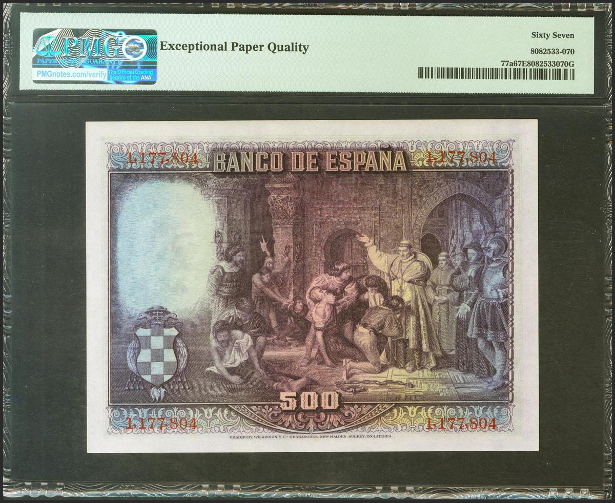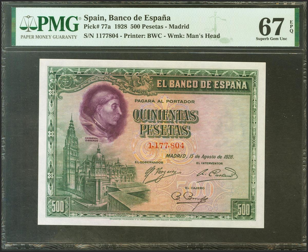 500 Pesetas. 15 de Agosto de 1928. Sin serie. (Edifil 2021: 356, Pick: 77a). Raro en esta excepcional calidad, apresto original. SC. Encapsulado PMG67EPQ.