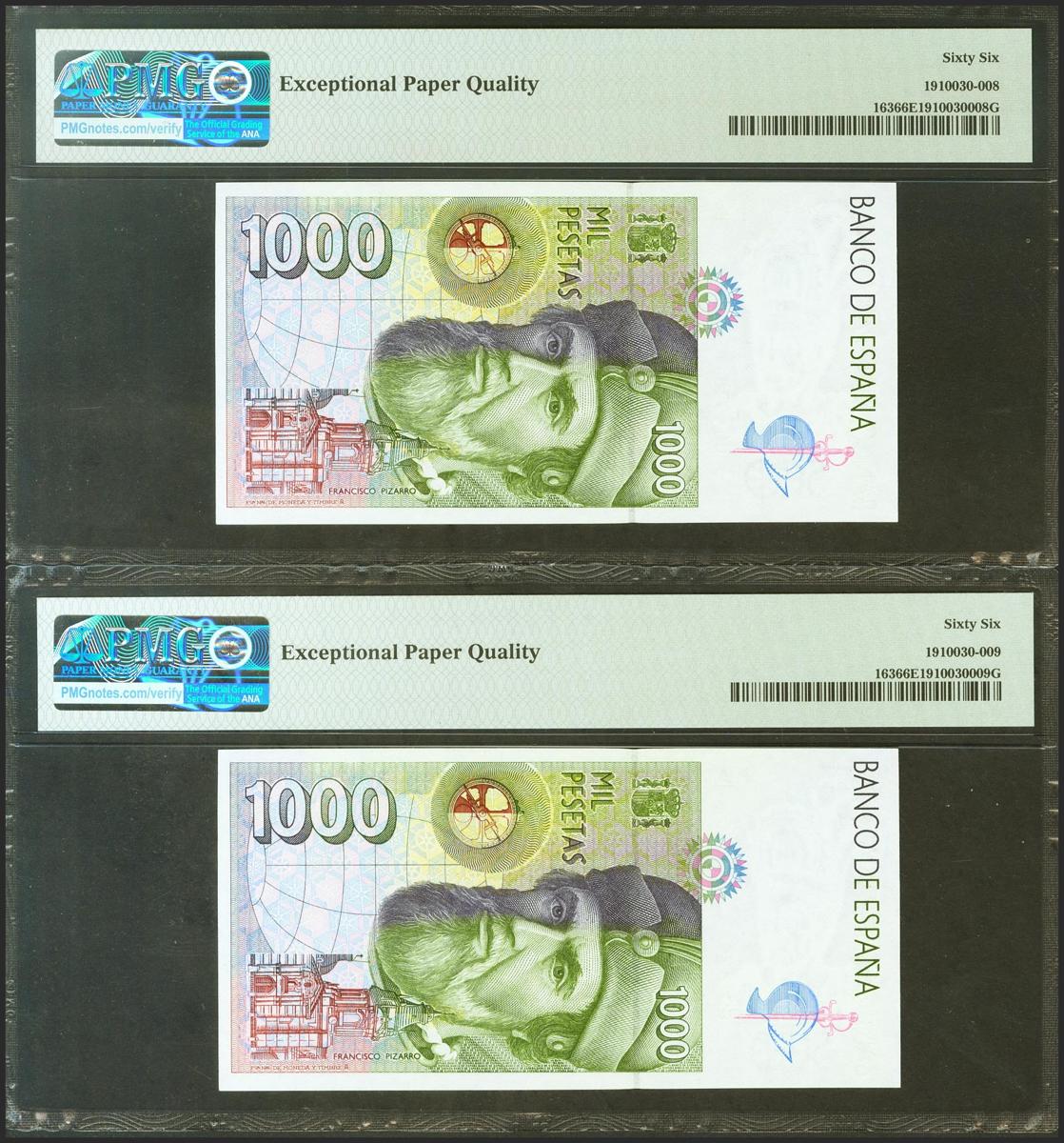 1000 Pesetas. 12 de Octubre de 1992. Pareja correlativa. Sin serie y numeración muy baja. (Edifil 2021: 483, Pick: 163). Inusuales en esta excepcional calidad. SC. Encapsulados PMG66EPQ, ambos.